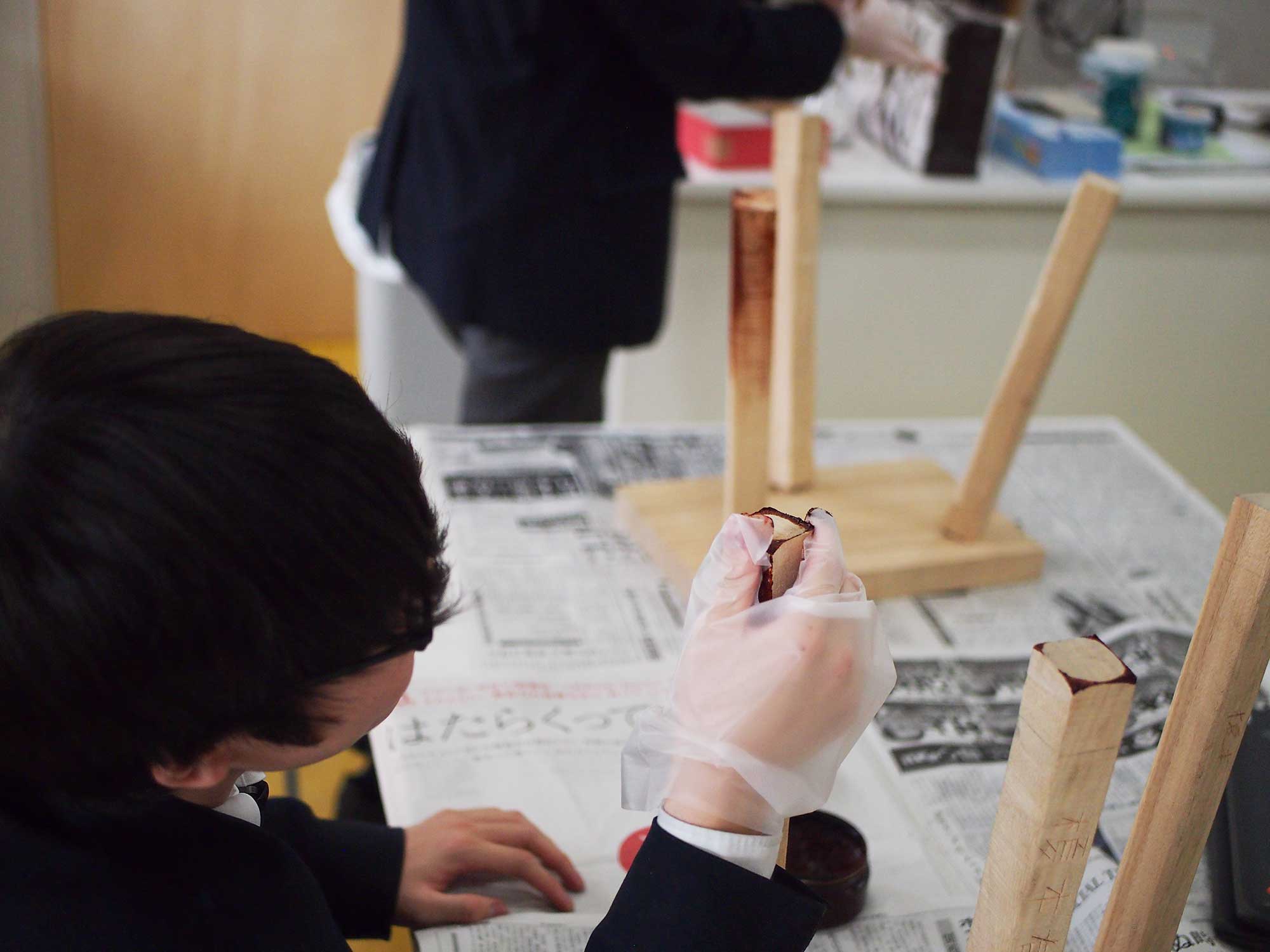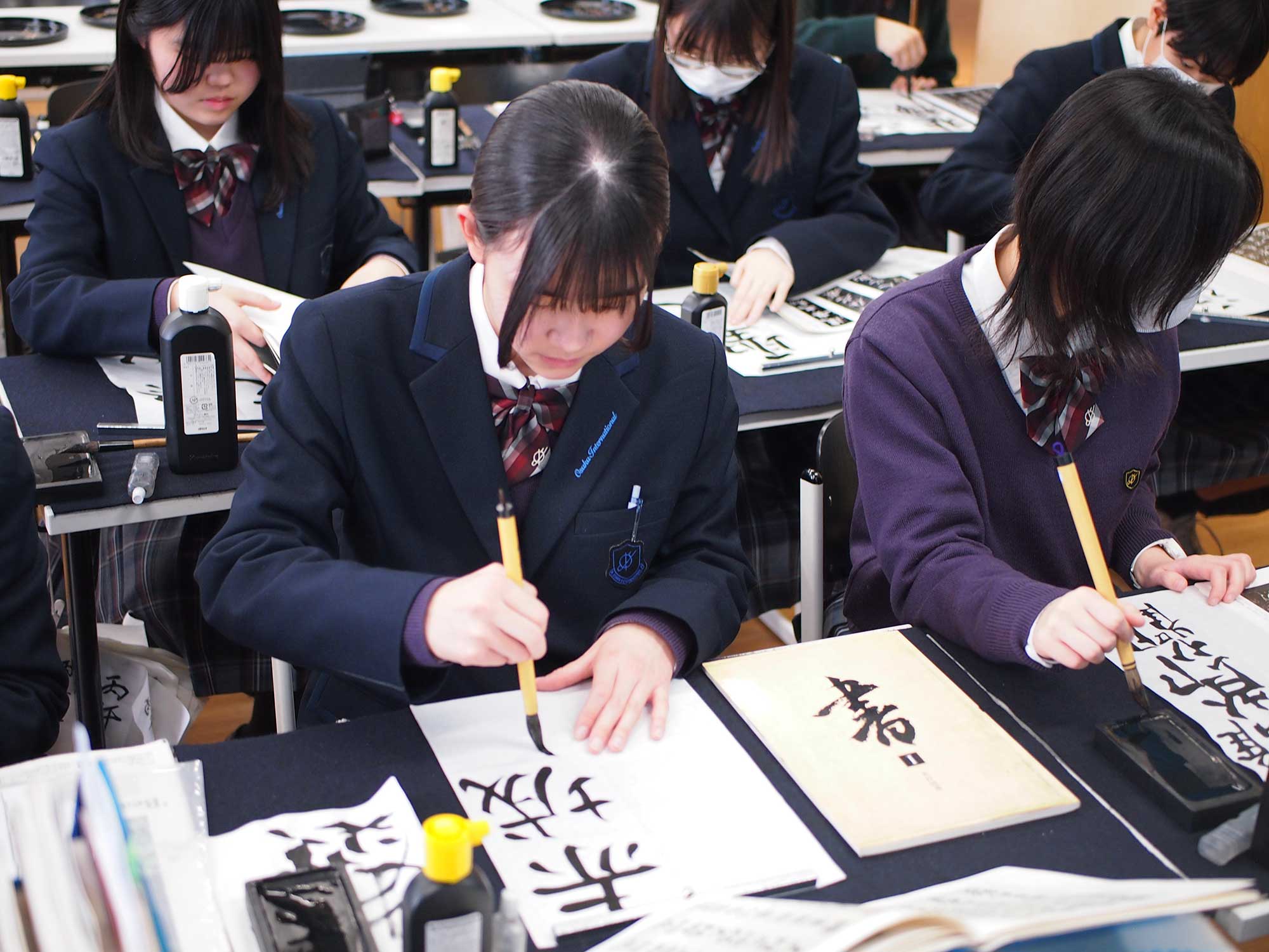 後期は「新しいことに挑戦する」をテーマに取り組みました。日本の伝統工芸「蒔絵」作品の華やかさ。墨絵作品の「和」を感じさせる佇まい。篆刻作品の力強さ。平安時代の変体仮名で書かれた小筆作品のたおやかな趣き。全ては、生徒一人ひとりが、熱心に心を込めて地道に作り上げていく誠実さが生み出したものと実感しております。笑顔の絶えない教室で、皆で励まし助け合い、尊重し合っている印象です。