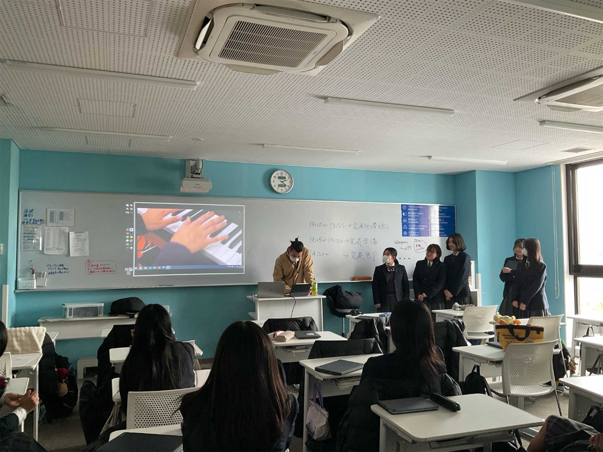 後期PBL(Project Based Learning)では、前期とは打って変わって、各自の決めたテーマについての発表を行いました。大きなテーマは「未来の社会」。未来に存在する職業や道具、自分が想像する“こうなってたらいいな“という世界について、オリジナルのアイディア出しから始まり、スライド発表まで行いました。生徒たちのアイディアはどれも面白いものばかりで、「人間ChatGPT」や「航空警察」、「思考で動かせる機械」…。今の中学生たちが社会に出たとき、実現している未来はあるのでしょうか。