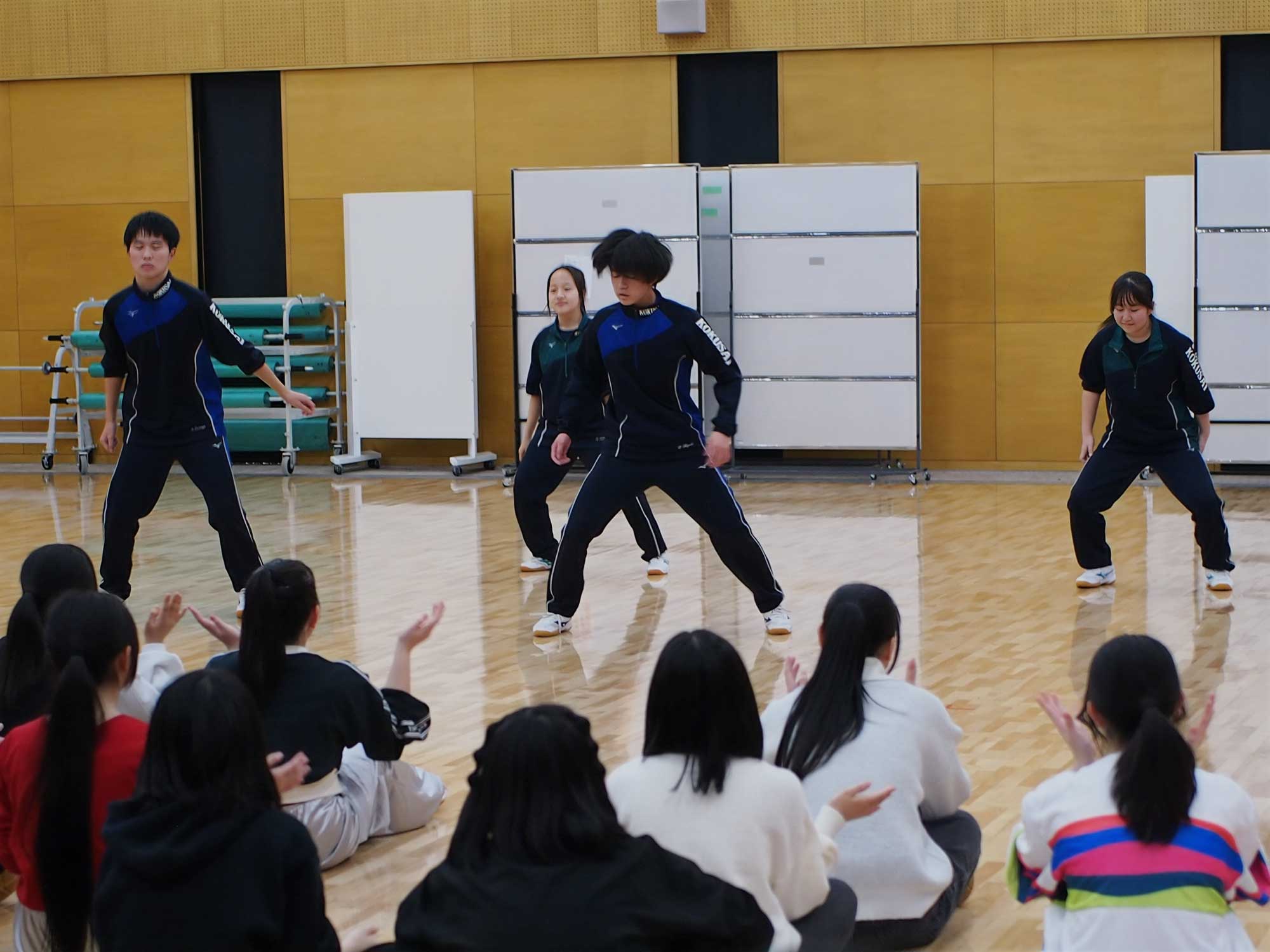 ダンスでは、各グループ作品を発表をしました。半期にわたりさまざまなステップを学び、最後の3回の授業ではそれらを生かして自分たちで振付を考え、作品づくりに取り組みました。経験の有無はそれぞれ異なりましたが、互いに協力し合い、一丸となって一つの作品を完成させました。本番では緊張も見られましたが、限られた時間とは思えない完成度の高い発表となりました。一人ひとりの前向きな姿勢がスキル向上につながったと感じられる発表会となりました。