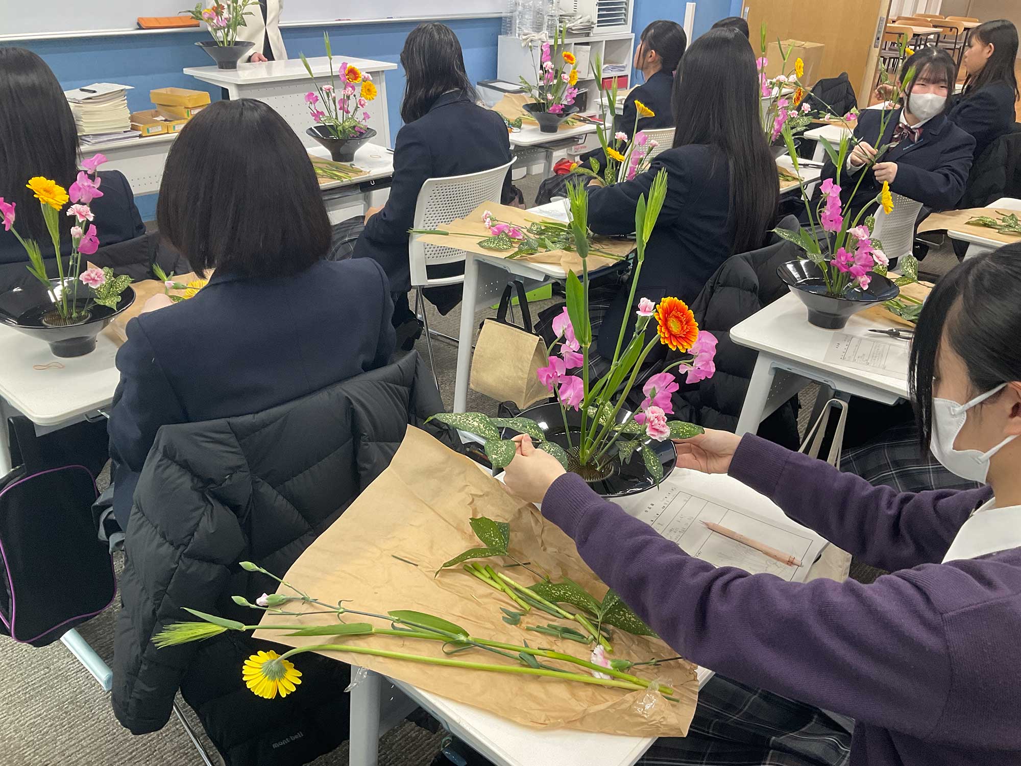 華道の講座では、ガーベラやゴッドなどの花材を手に取り、花言葉や花の色合い、形などからイメージを膨らませながら思い思いに表現しました。初回の講義では生け方に戸惑い時間がかかる様子も見られましたが、回を重ねるごとに手際も良くなり、集中して真剣に作品づくりに取り組む姿が印象的でした。花と向き合い、想像力をはたらかせて表現していくことで、豊かな時間となりました。