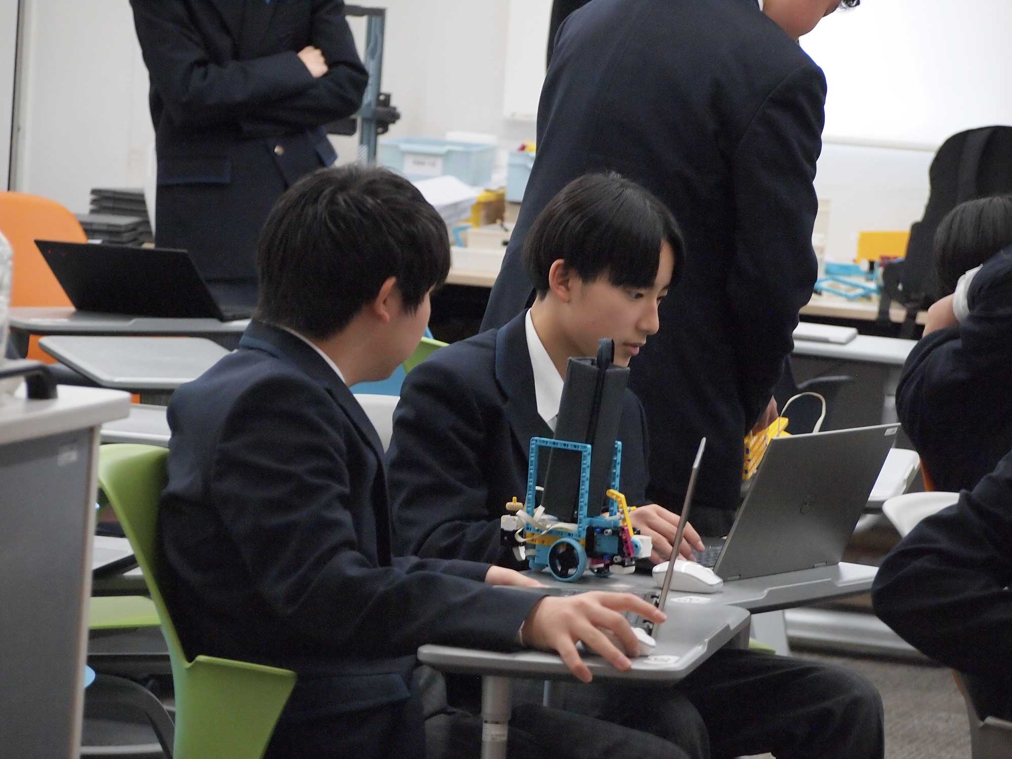 「LEGO SPIKE」(レゴスパイク)という中高生向けの STEAM 学習セットを用いて、本校の情報科教員がプログラミングを教えています。今後はロケットにかわる宇宙への輸送機関「宇宙エレベーター」をイメージしたロボット(クライマー)をレゴブロックで組み立て、プログラミングによって動かすことを学んでいます。どんなプログラム・構造がよいか試行錯誤することで、問題解決能力を育成します。