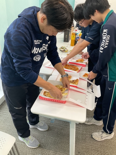 あいにくの雨天で、毎年恒例?の練習納め「鶴見緑地トレーニング」は断念。体育館でのトレーニングとなりました。陸上部は雨天時、体育館の階段や3F駐車場を使って練習しています。階段トレーニングは、下半身の筋力強化や瞬発力アップに効果的です。ももをしっかりと上げて何往復もするこの練習は、かなり負荷がかかるのですが、寒い冬に汗だくになりながら頑張る顔には、いつも達成感が満ちています。