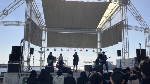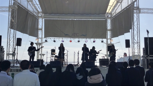 私たちは3/8(日)に東日本大震災での復興チャリティーイベントであるSing of the futureに参加しました。場所は南港ATC 海辺のステージという、空と海の蒼がとても映える素晴らしいところで演奏させていただきました!。天気も快晴でとても気持ちよかったです!(でもかなり寒かったです)。