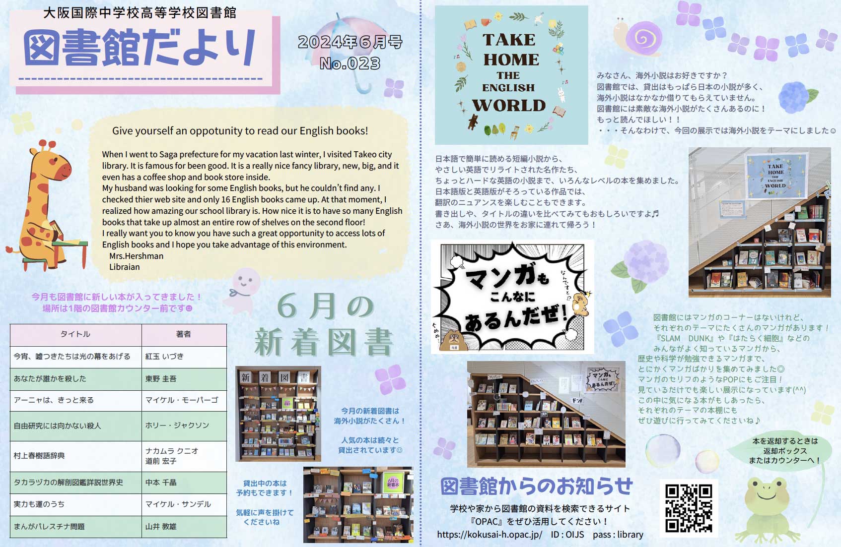 私の夫が英語の本を探したのですが、見つかりませんでした。私がウェブサイトで調べてみると、たった16冊しか出てきませんでした。その時、私は大阪国際中高の図書館がいかに立派な図書館であるかということに気づきました。2階の本棚のほとんど全部をたくさんの英語の本が占めているなんて、なんて素晴らしいんでしょうか!私は、皆さんがたくさんの英語の本に触れる機会があることを本当に知って欲しいし、この有利な環境を活かして欲しいと思っています。