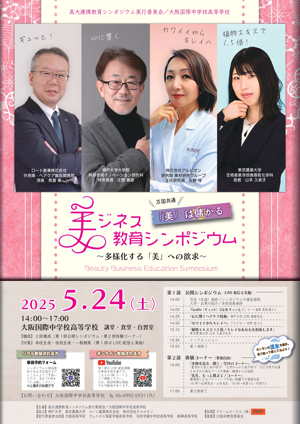 その活動の一環として、5/24(土)に「美ジネス教育シンポジウム」を本校講堂で実施します。神戸大学・東京農業大学・ロート製薬・アルビオン、といった大学や企業の方の研究・開発内容や講演を聞くことができます。当日はオホーツクから本物の流氷がやってくるなど、学びに加えて体験をすることができるシンポジウムになります。