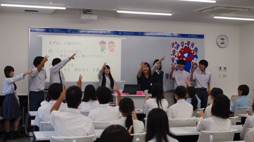 幼児保育進学コースは平田先生と在校生が進行しました。手遊びを中心とした体験授業形式です。