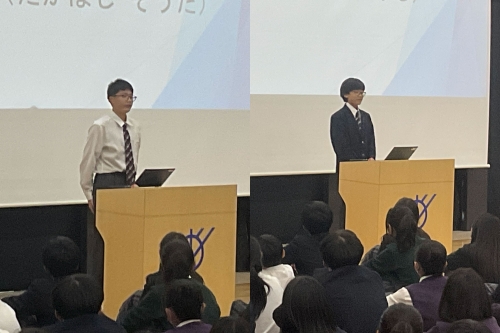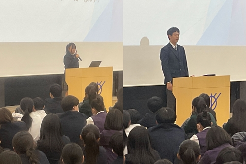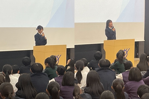 生徒会 2025.11.13 11月12日水曜日に、後期生徒会役員選挙と立会演説会を行いました。 演説会では、各々で考えた、学校のためになることや生徒のためになることを公約に掲げ、一生懸命に演説してくれていました。 今回は、定員の6名ぴったりの立候補者数だったので、信任投票が行われ、全員過半数の信任票を得られたので、当選となりました。 来週には認証式があるので、意気込みはその時のお楽しみに! 立候補者の皆さん、本当にお疲れ様でした! 当日の司会進行や開票作業などを行ってくれた選挙管理委員の皆さんもありがとうございました!