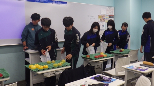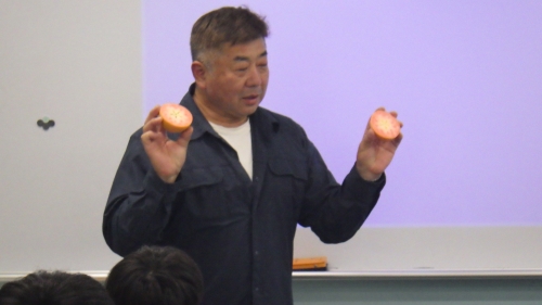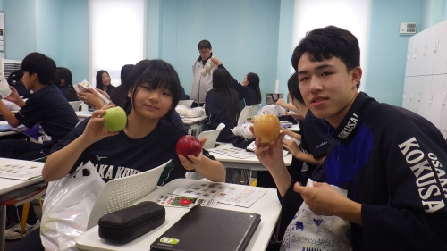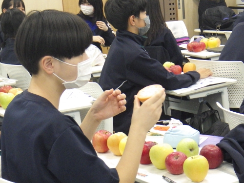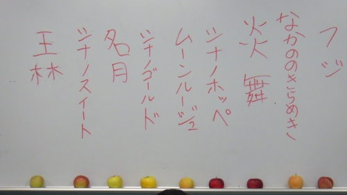 また、果樹専門で農家をされている塩崎農園の塩崎様にはりんごについてのお話をしていただきました。また、塩崎様が中学2年生で果樹農家を志したお話などもしていただき、これから発志式に向けて準備を始める2年生にとっては貴重なお話を聞くことができました。また、お土産に9種類のりんご(王林、秋映、シナノゴールド、シナノスイート、シナノホッペ、ムーンルージュ、王林、名月、炎舞)をいただき生徒たちは大満足でした。塩崎様本当にありがとうございました。