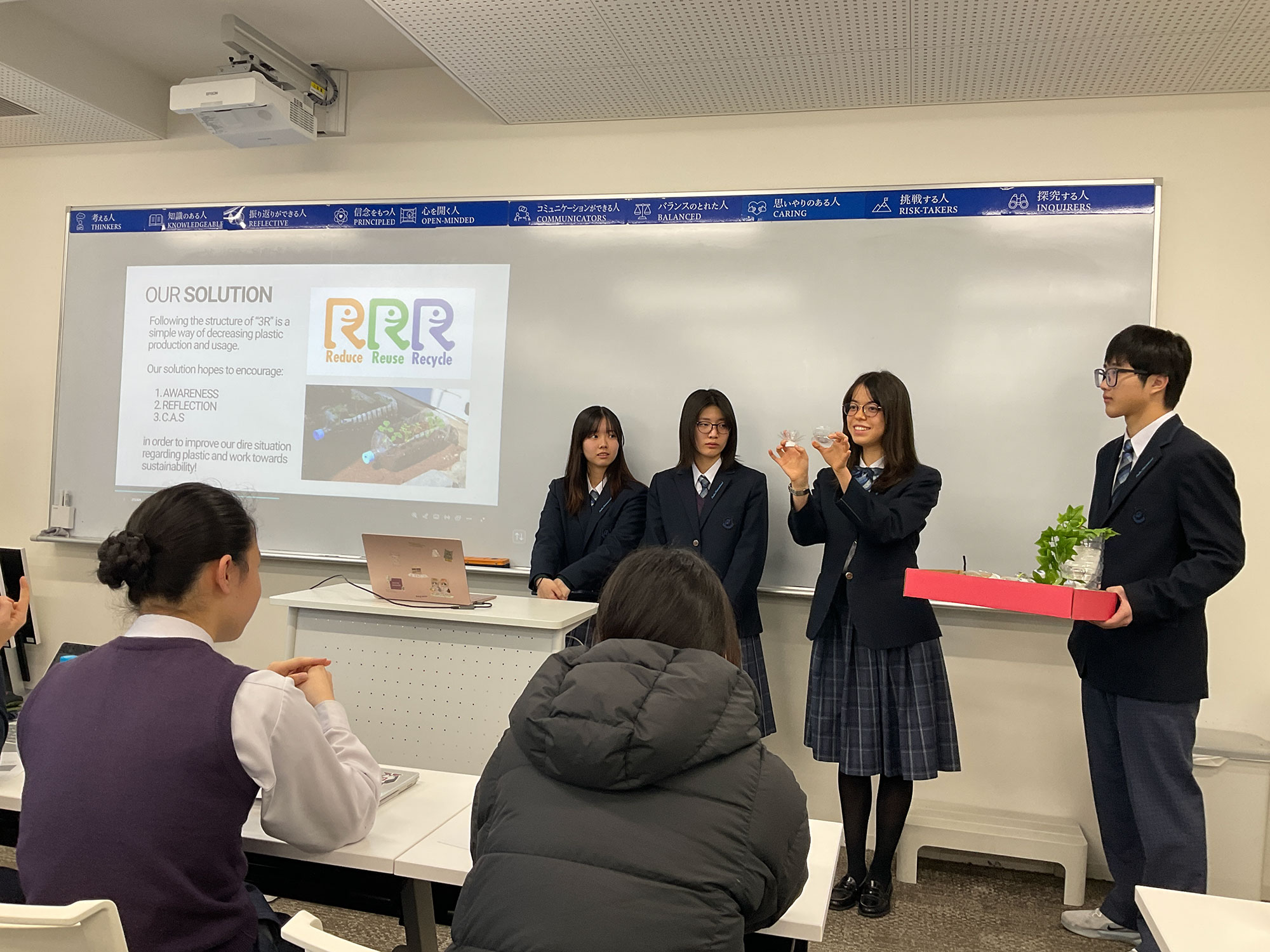 コラボレーティブ・サイエンス・プロジェクト(CSP)は、国際バカロレア・プログラムの一環として、生徒が学際的なチームで協働しながら取り組む探究型プロジェクトです。生徒たちは、生物、化学、環境システムと社会(ESS)で身につけた知識や技能を活用し、科学的手法を用いて現実社会の課題に取り組みました。プロジェクトを通して、「調査力」「協働力」「振り返りの力」を高めることができました。学習過程の記録を重視しつつ、最終発表では簡潔で分かりやすく、聴衆の関心を引く構成となるよう工夫が見られました。また、手作りの成果物の制作やディベートの実施などを通して、来場者が地球規模の課題について主体的・批判的に考える機会を提供しました。