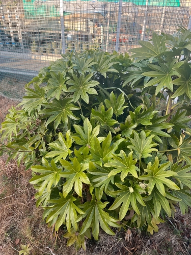 しかし、そんな中で低木の照葉樹であるヤツデは比較的元気です。葉に特徴的な切れ込みがあり、別名「テングノハウチワ(天狗の葉団扇)」などと呼ばれ、誰でもすぐに覚えることのできる植物です。今回はヤツデのユニークなところを紹介します。