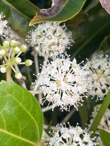 その1、花のつき方がユニークです。小さな花はボール状に咲き(小花序といいます)、さらにそのボール状の花のかたまりが円錐状に配置されるという形になります。校内のヤツデはこの円錐状の配置がややわかりにくいですが。