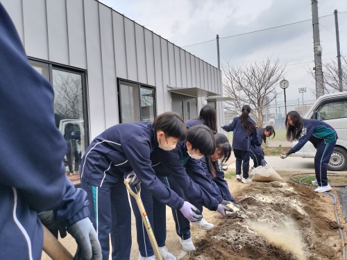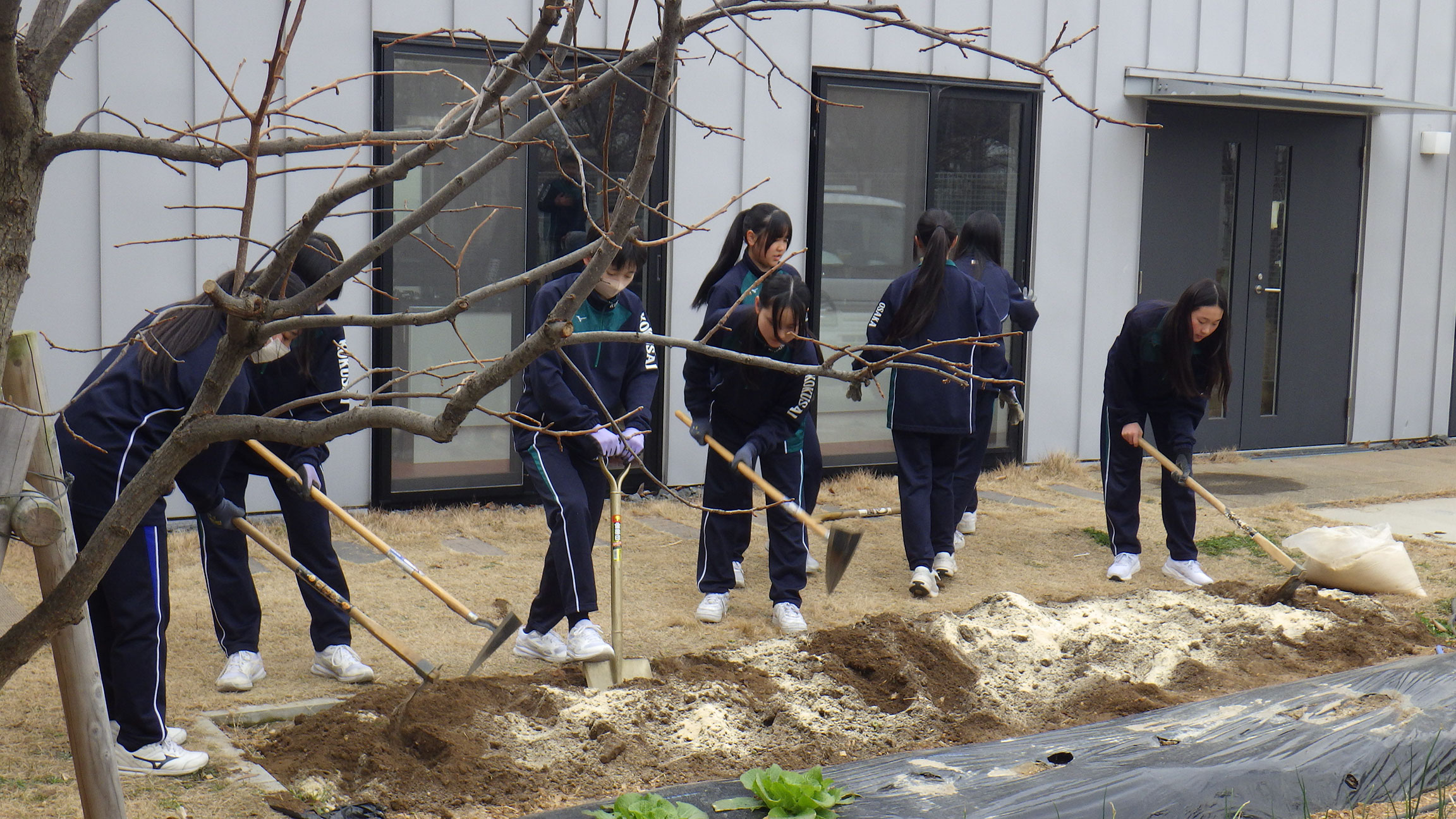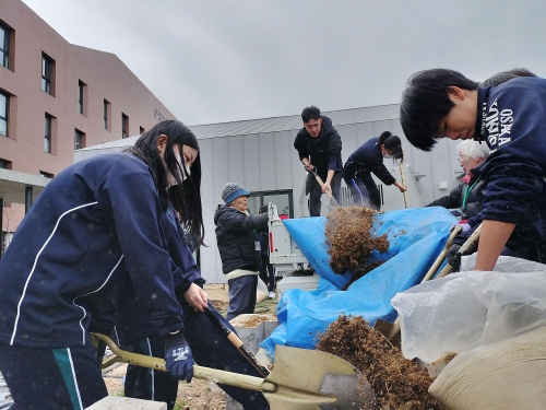 ジャガイモの植え付けに向けて土作りを行いました。大枝公園さんを通じて鶴見緑地からいただいただいた栄養満点の馬ふんと米ぬかを土に混ぜ込み、マルチを張って畝を立てました。
