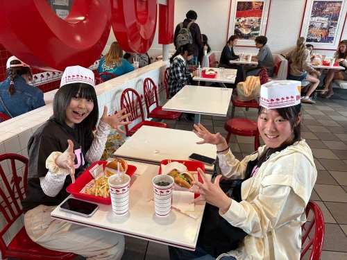 その後、UCLAストアでお土産を購入し、ウェストウッド地区へ移動しました。スーパーで買い物をした後、In-N-Out Burgerで夕食をとりました。日本人メジャーリーガーの大谷翔平選手も「美味しい」と絶賛したことで知られるハンバーガー店です。噂どおり、「今まで食べた中で一番おいしいハンバーガーだった」と生徒たちにも大変好評でした。