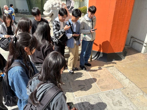 その後、ハリウッドへ移動し、有名俳優の手形や足形が刻まれている「チャイニーズ・シアター」を訪れました。日本人で唯一ここに手形と足形を刻んでいるのは、ミュージシャンのYOSHIKIさんだそうです。3月15日にアカデミー賞授賞式が開催される予定で、周辺では準備が進められていました。授賞式の会場となる「ドルビー・シアター」の前でも記念撮影を行いました。