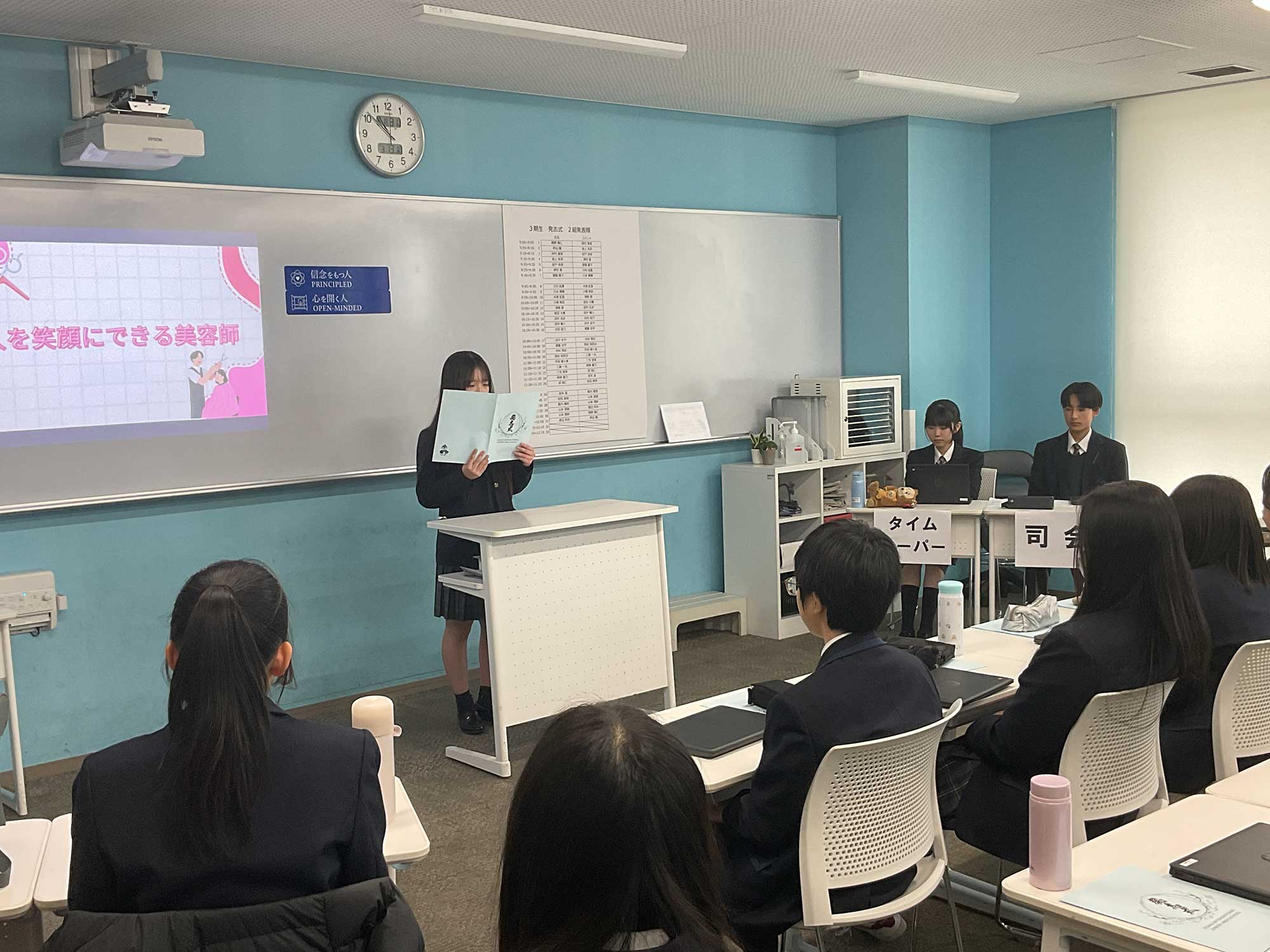 また、発表する生徒だけでなく、それを真剣に聞く生徒たちのまなざしにも驚かされました。互いの思いをしっかり受け止めようとする姿からは、彼ららしい仲の良さや温かな雰囲気が感じられる一日となりました。