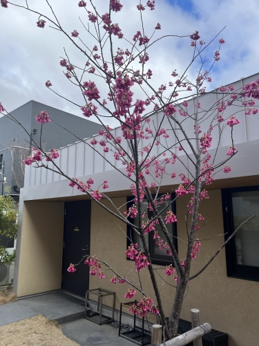 和室棟のカンヒザクラが満開で、一足先に春の到来を告げています。